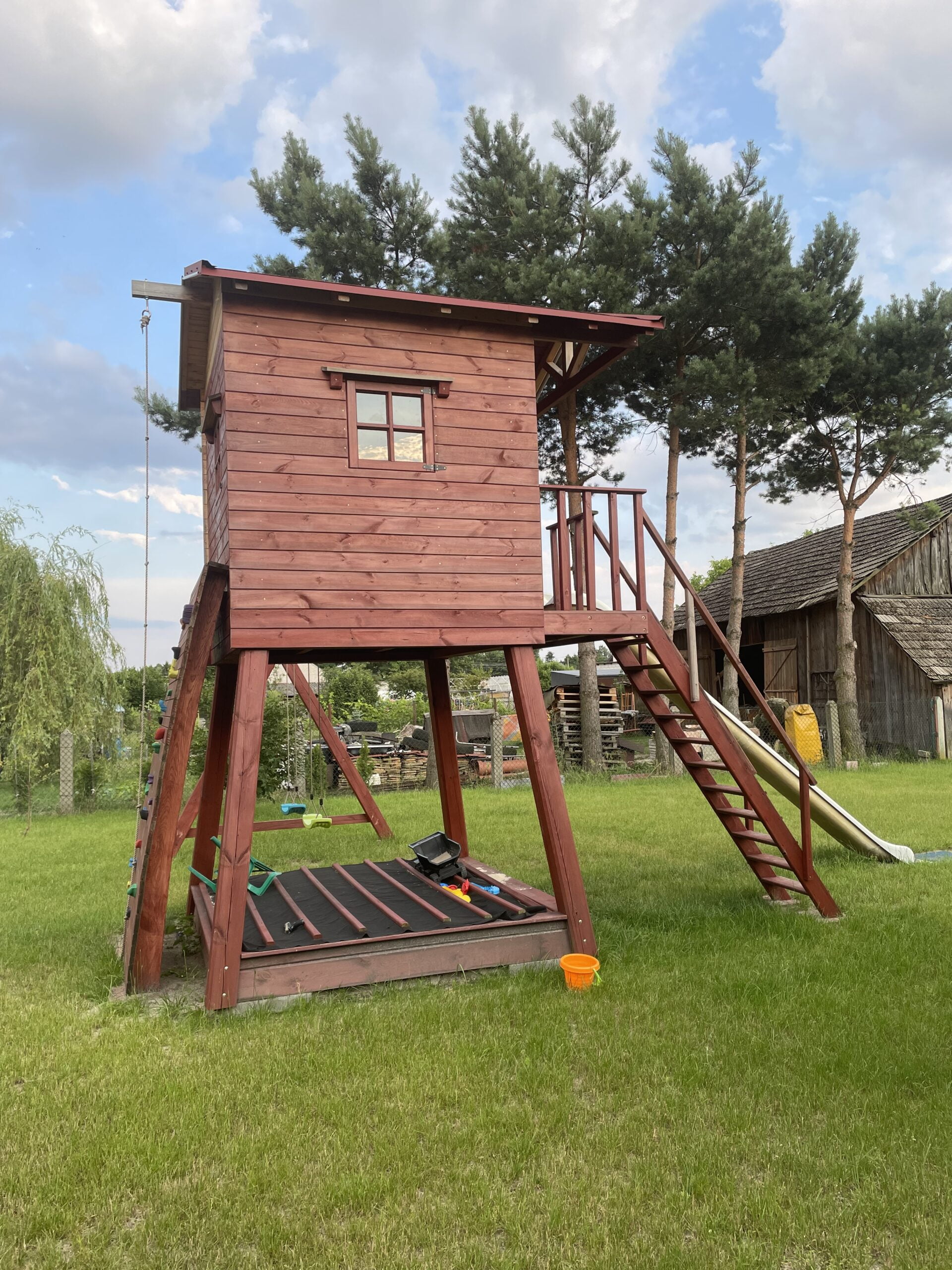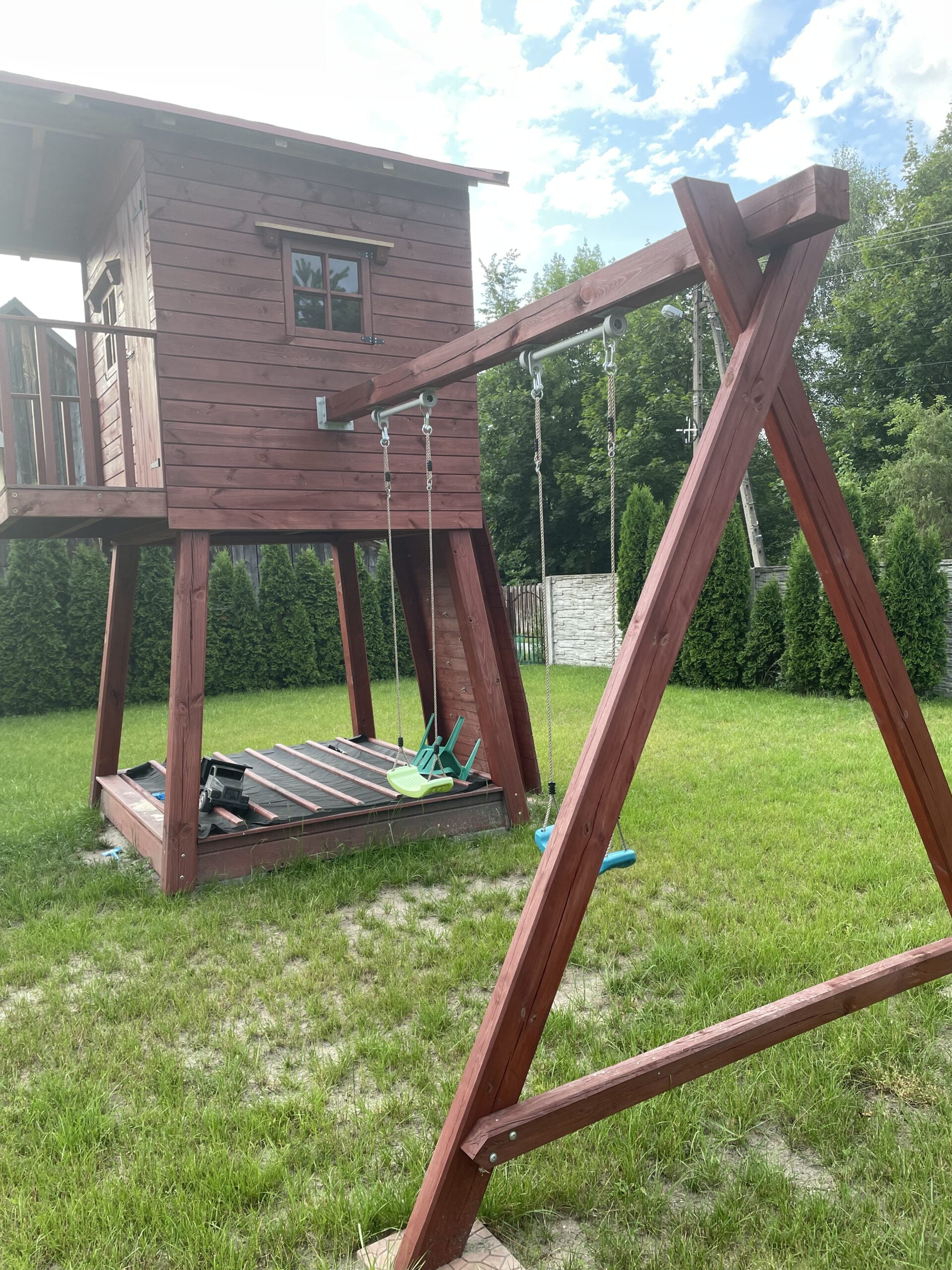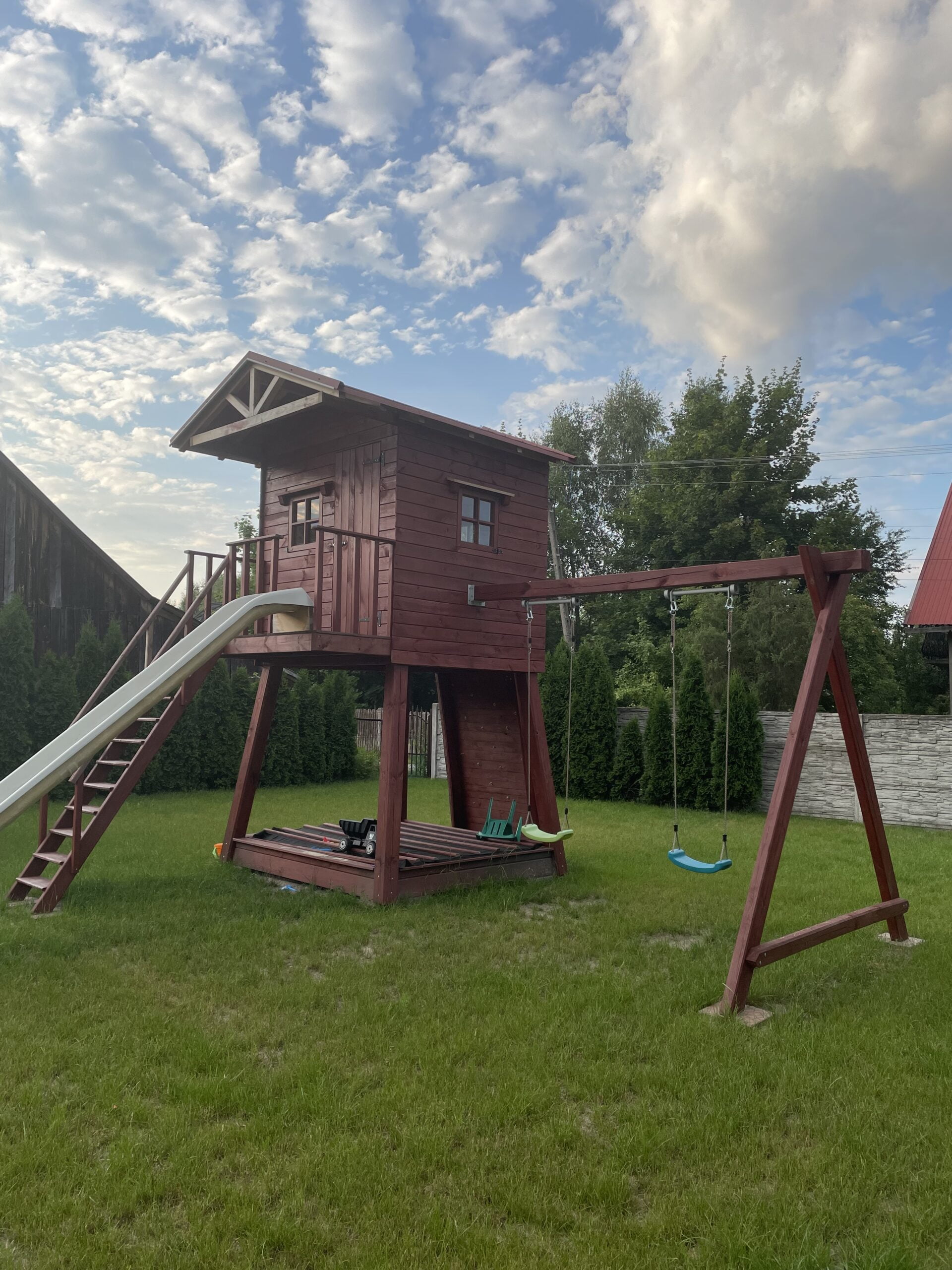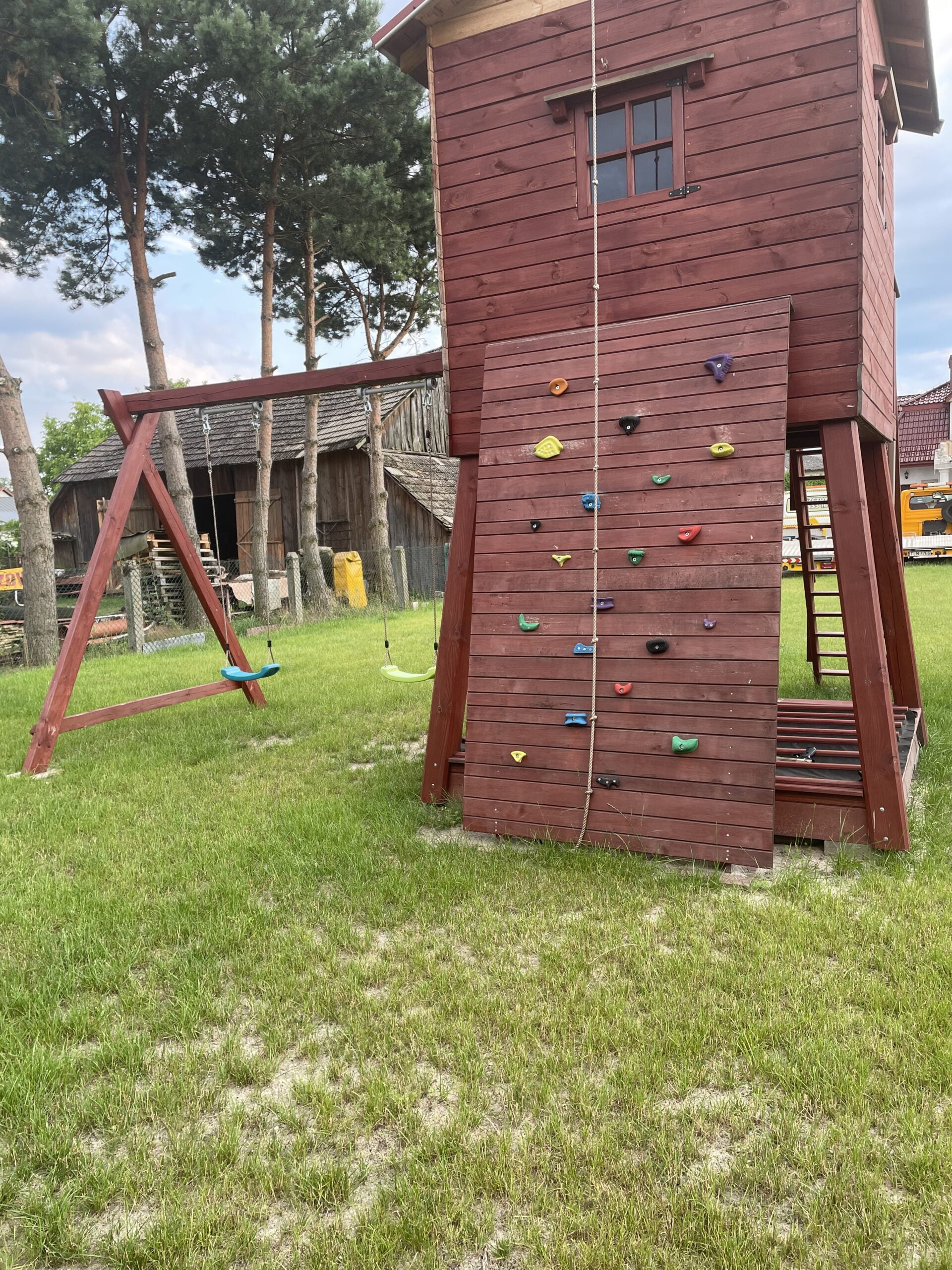 Domek dla dzieci ze ścianką wspinaczkową, zjeżdżalnią, piaskownicą i dwoma huśtawkami.