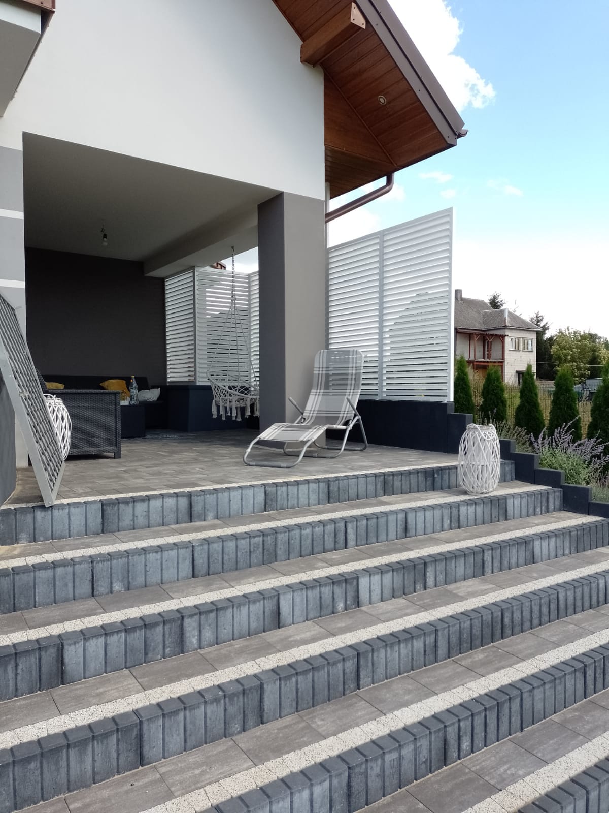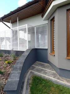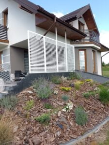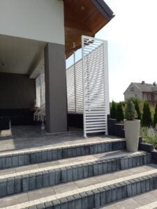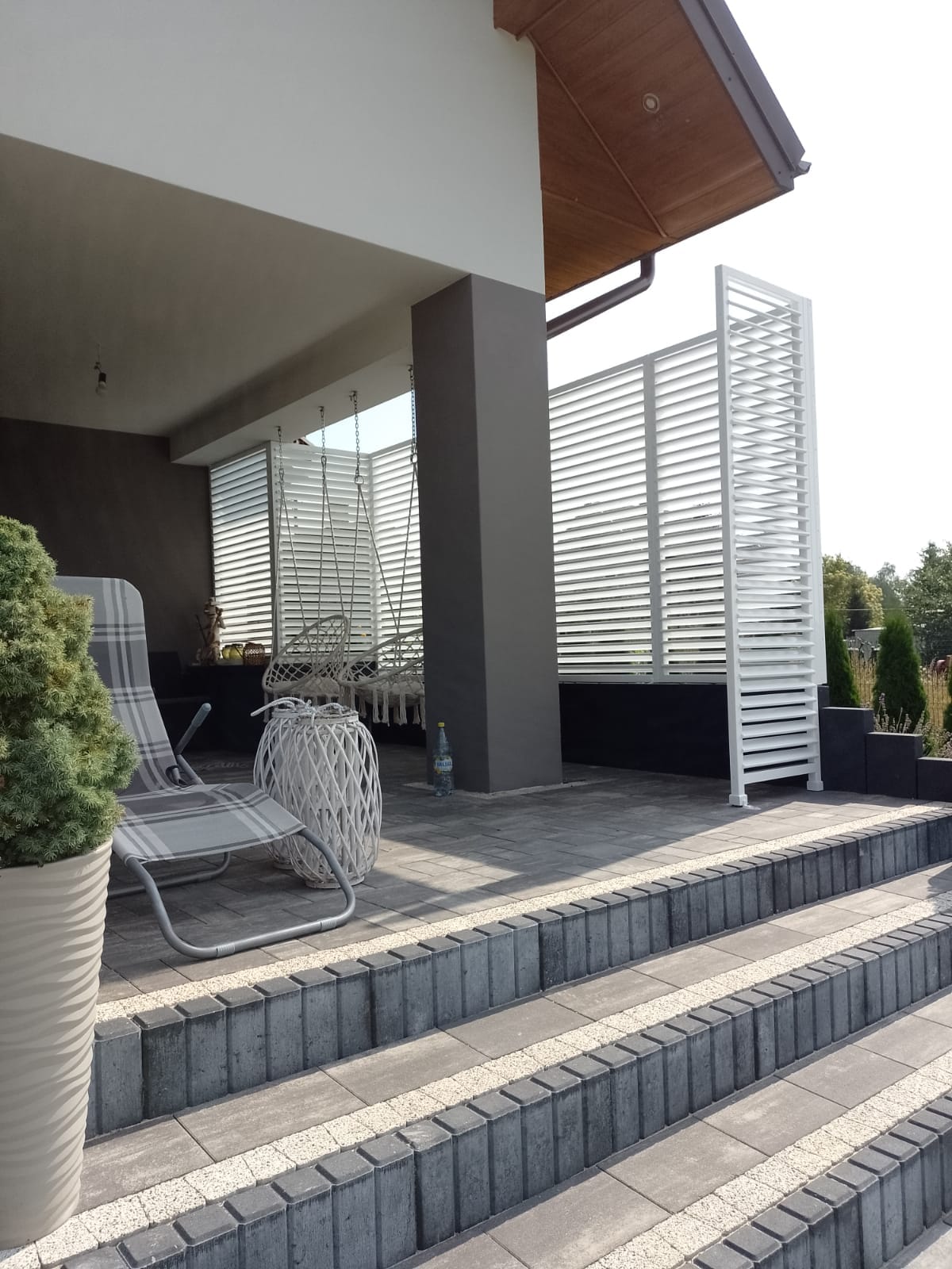 Drewniana zabudowa tarasu z paneli żaluzjowych (tzw. żaluzje tarasowe).