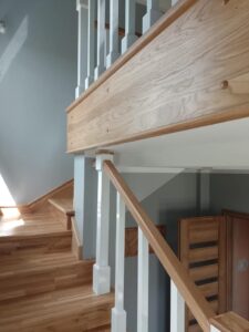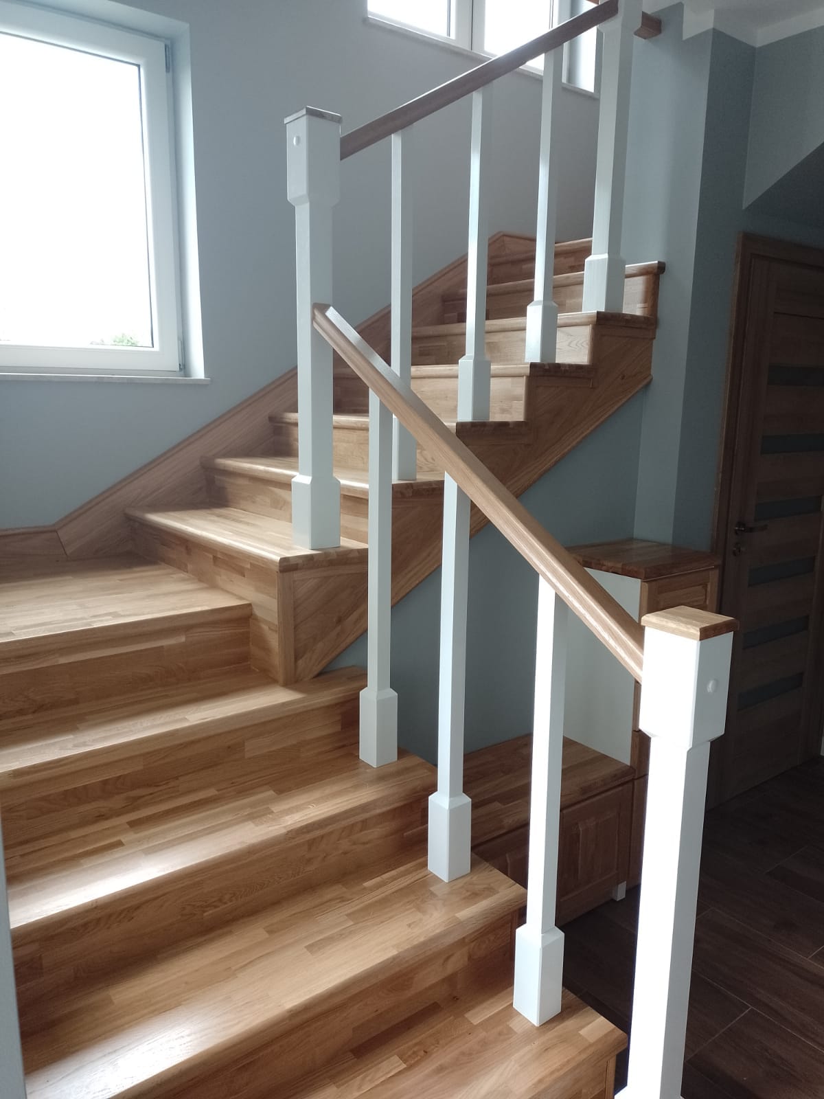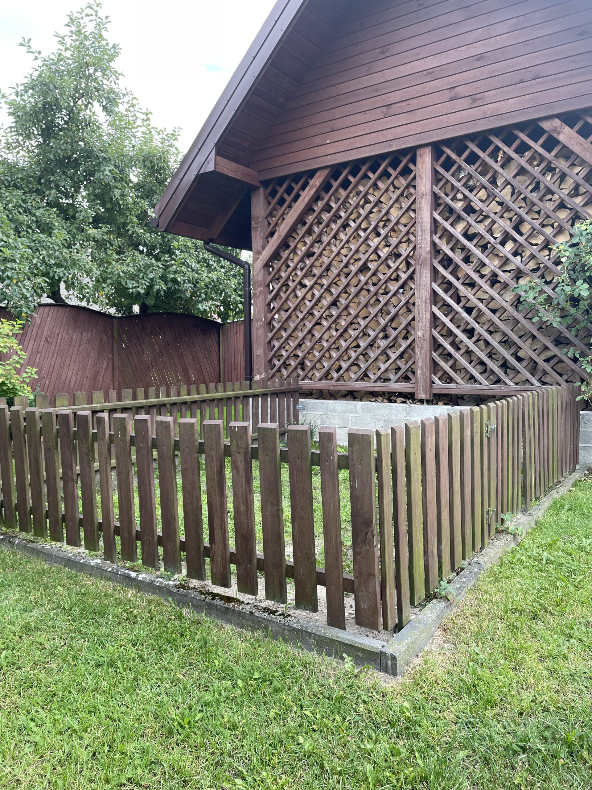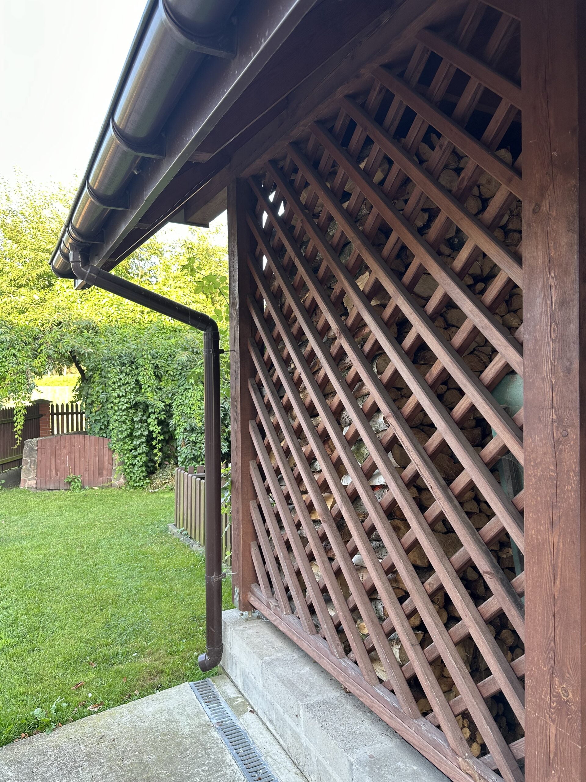 Drewniana zabudowa tarasu z paneli żaluzjowych (tzw. żaluzje tarasowe).