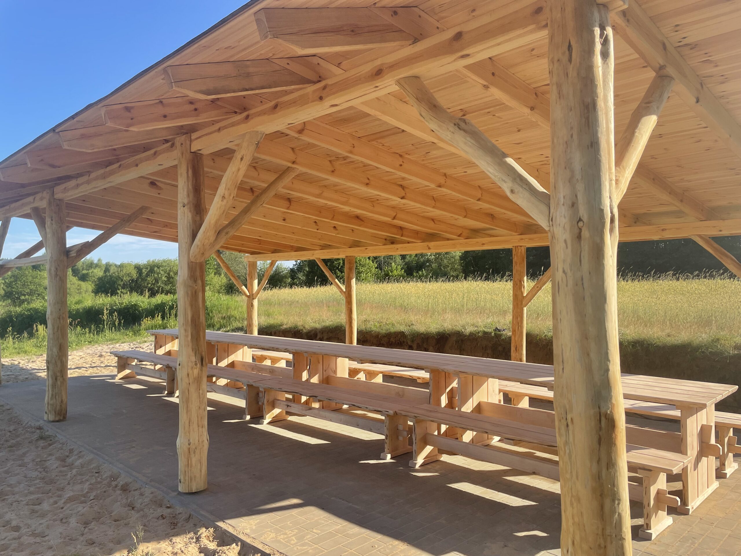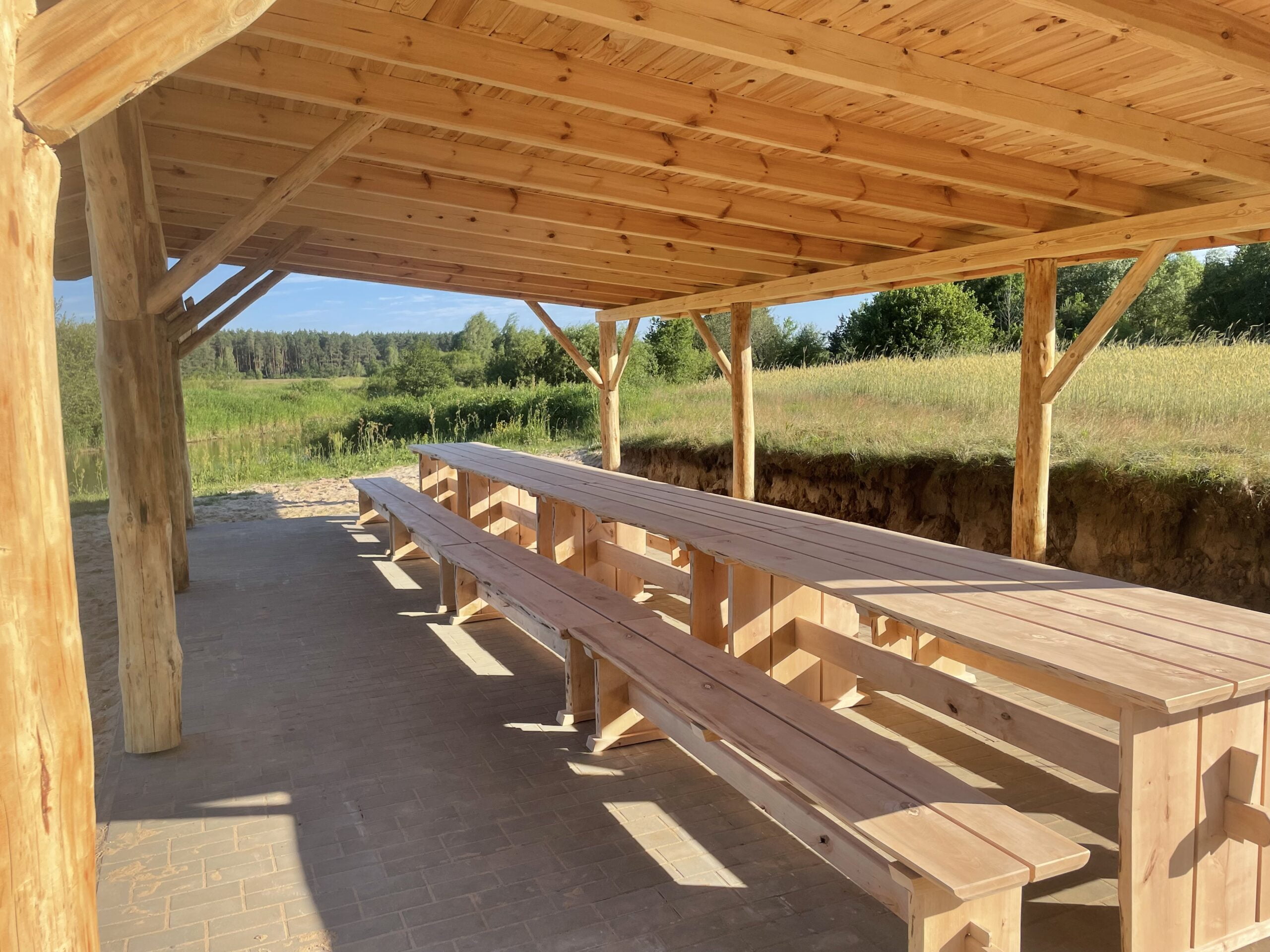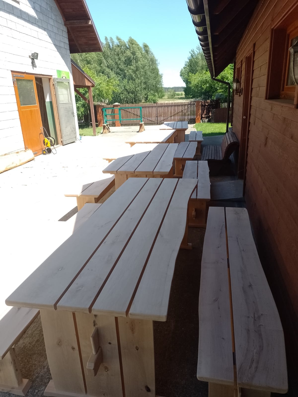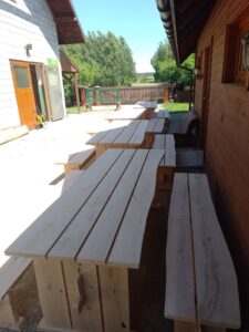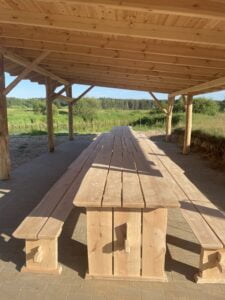Drewniane ławy i stoły do przystani wypożyczalni kajaków kajakiemOK.