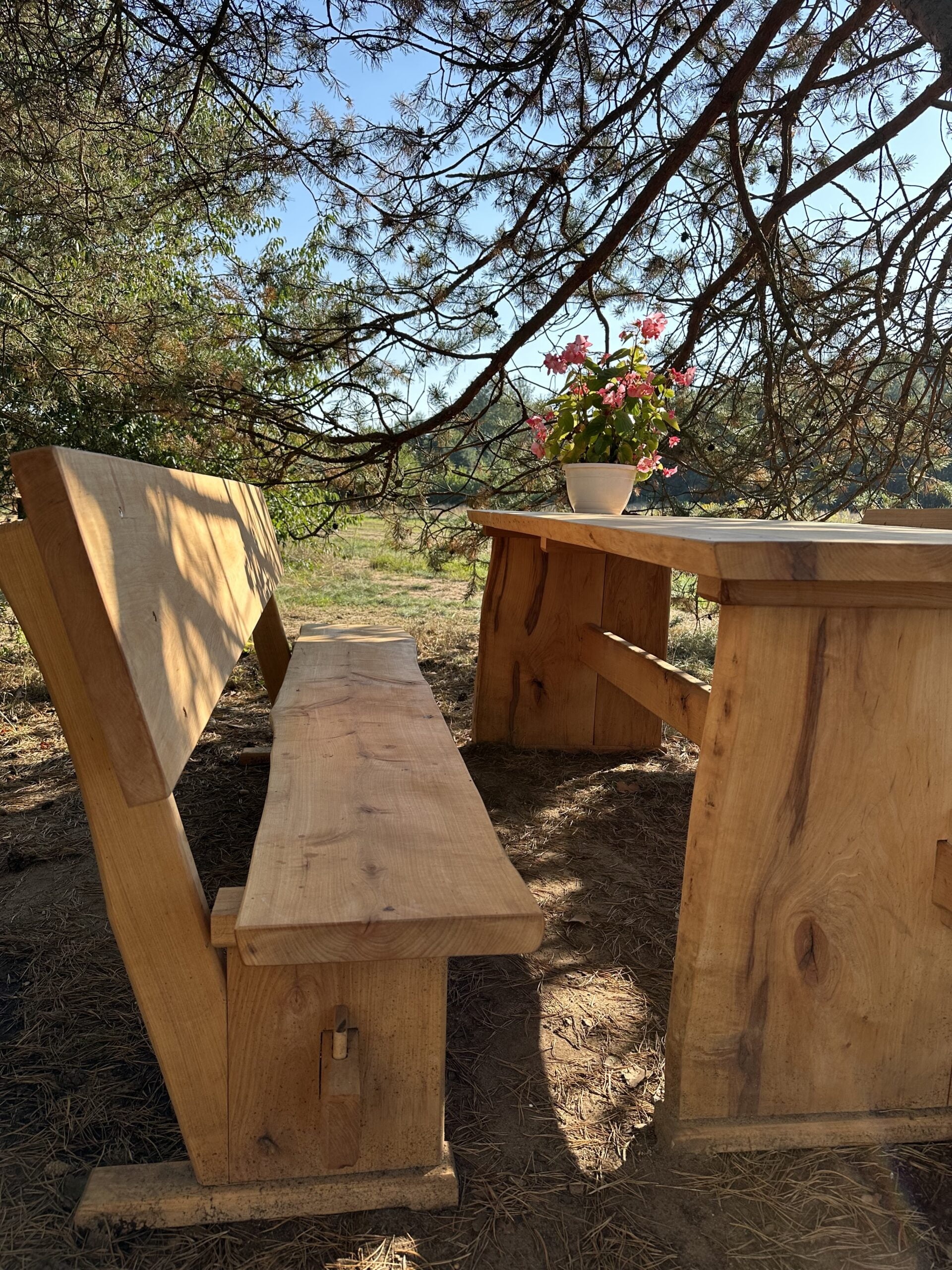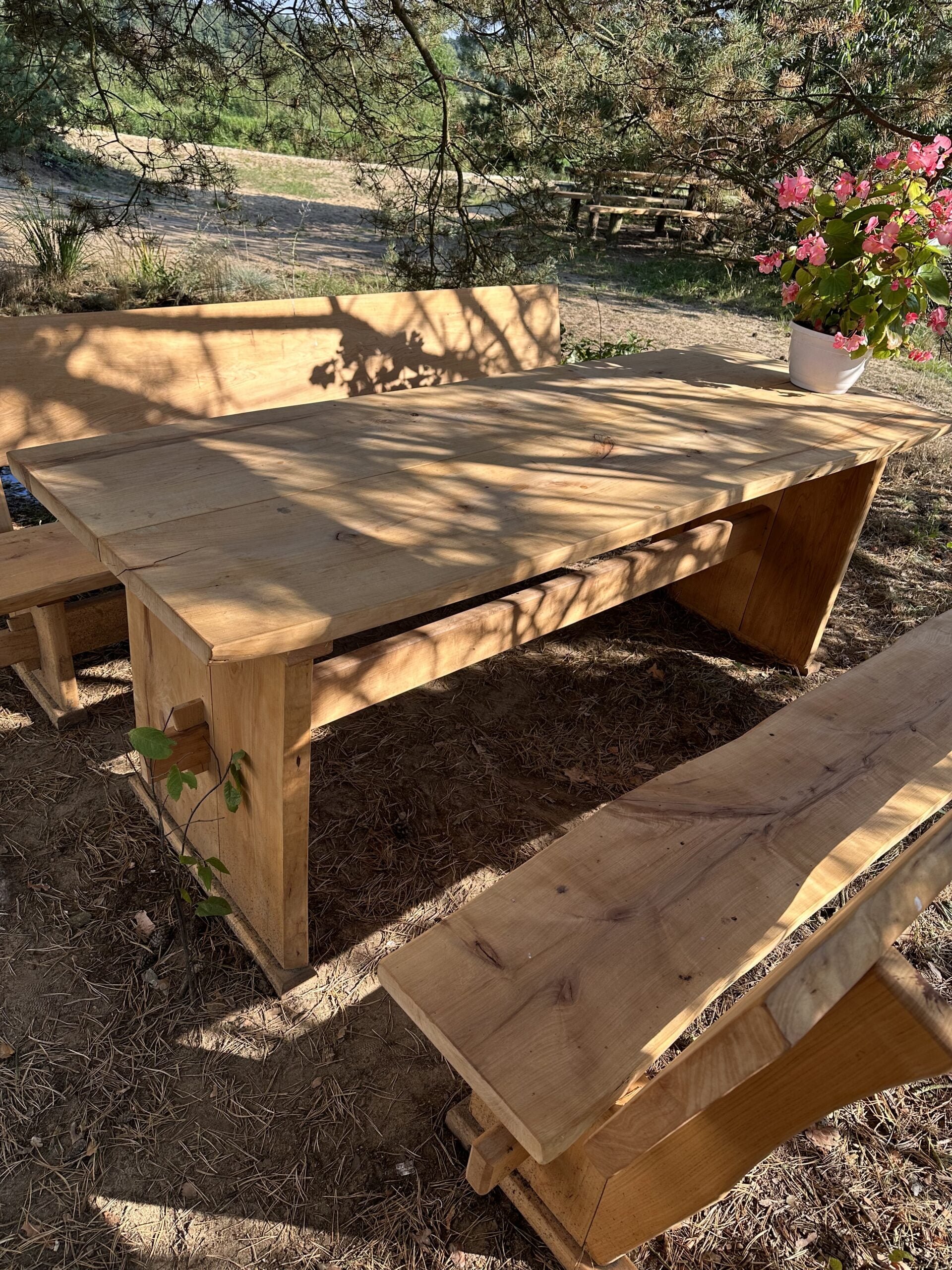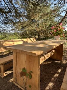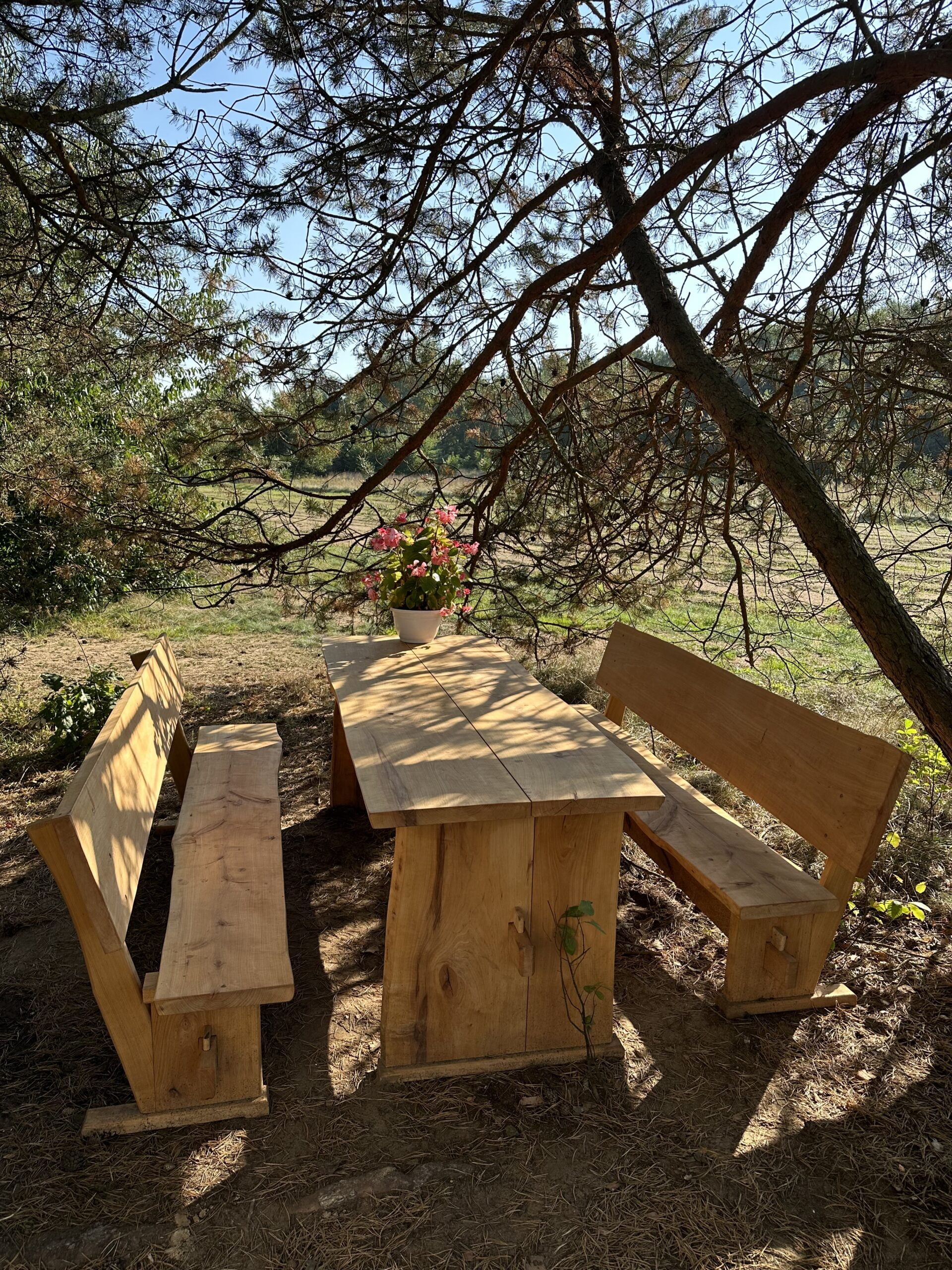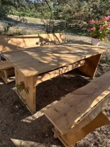 Drewniane ławy i stoły do przystani wypożyczalni kajaków kajakiemOK.