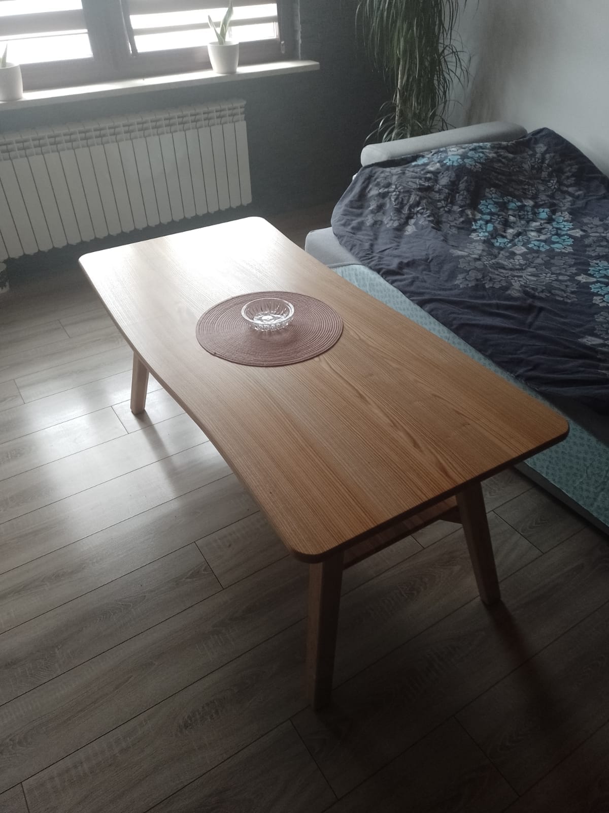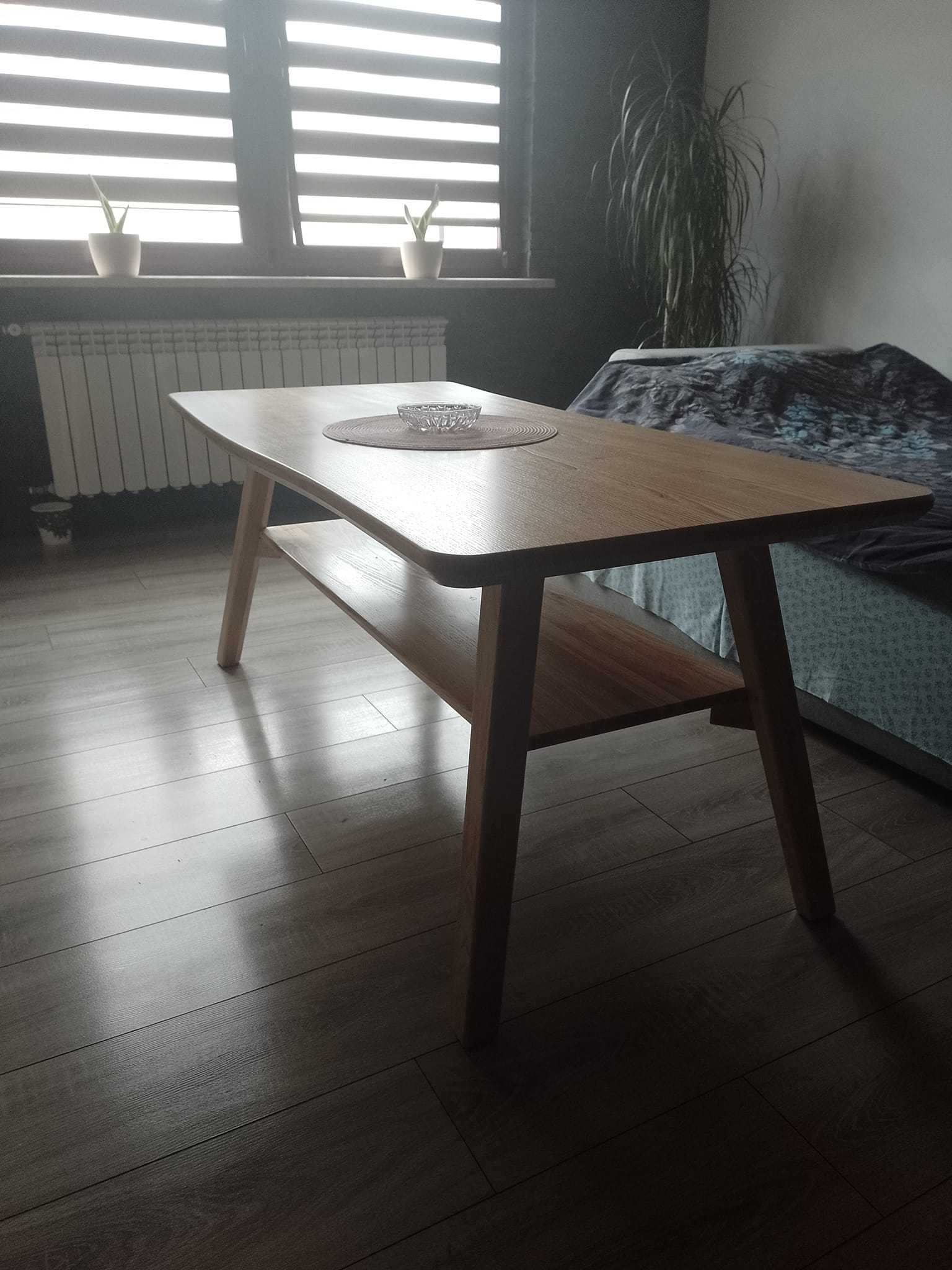 Stolik kawowy z blatem w naturalnym kształcie drewna i dodatkową półką.