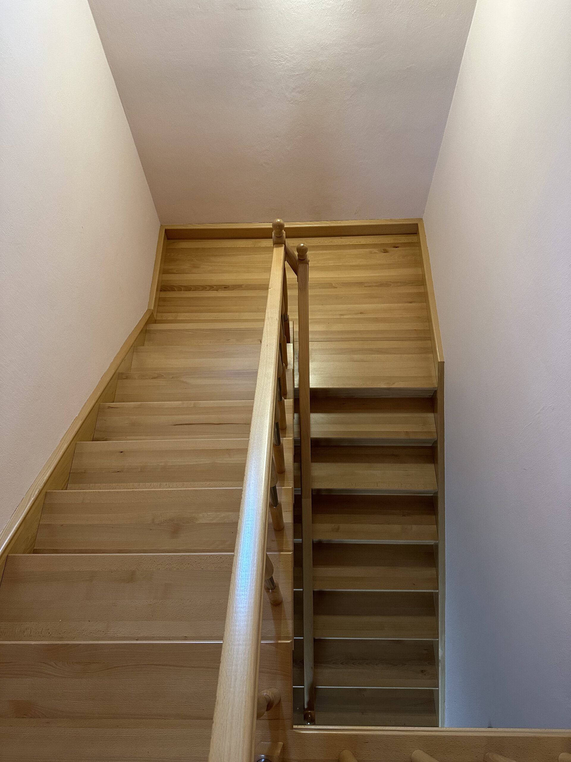 Dwubiegowe powrotne schody sosnowe z drewnianymi balustradami.